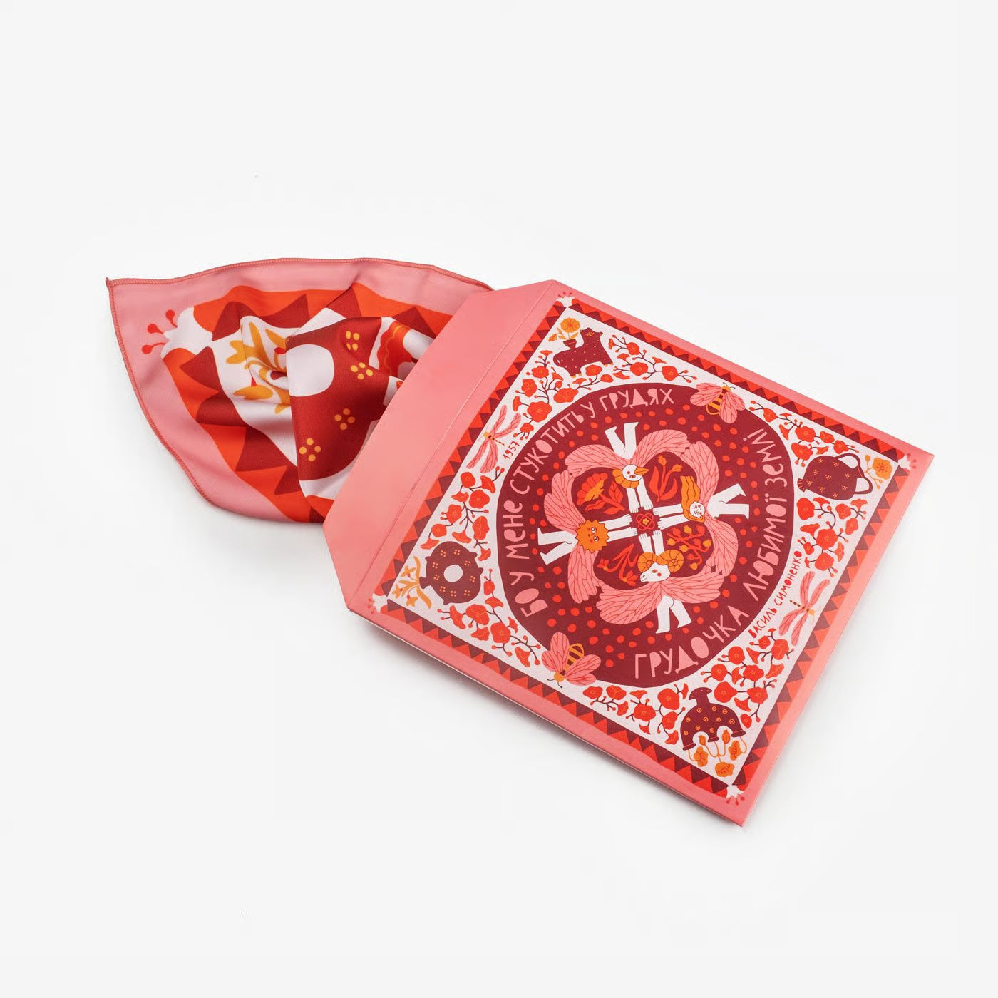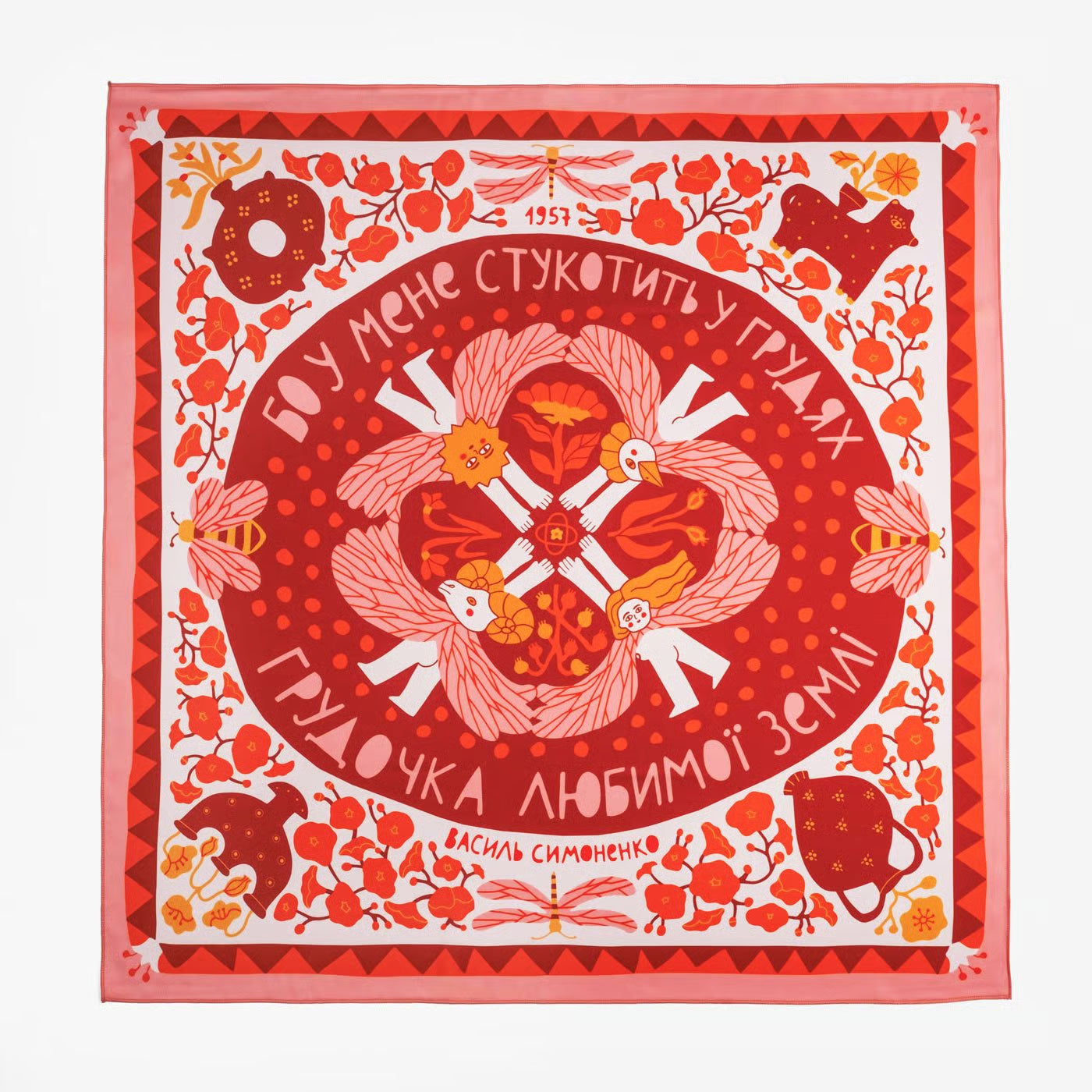 The scarf is a tribute to the profound longing for creation in all its forms. Its inspiration derives from the heartfelt poetry of Vasyl Symonenko’s “A Lump of Earth,” which brims with love for the homeland. Excerpts from the poem grace the scarf’s design, infusing it with poetic resonance.